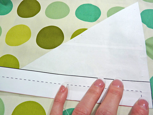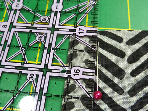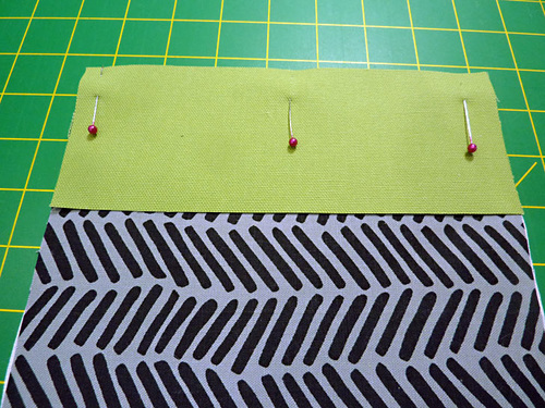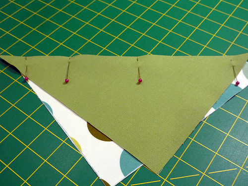 - Aligning these two dots, place each print and solid rectangle right sides together and pin along the diagonal.