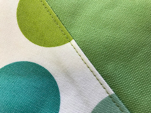- Re-thread with thread to best match the darker fabric in the top and bobbin, slightly lengthen the stitch. Topstitch in place within the print panel.