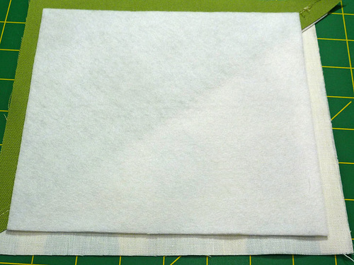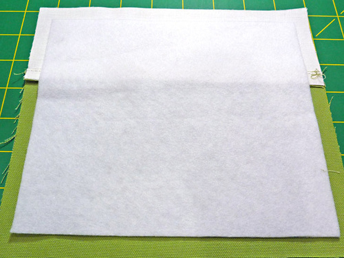 - Find the fusible fleece rectangles. Place a fleece panel on the wrong side of each assembled exterior panel. The fleece should be centered so there is ½” of fabric showing beyond the fleece on all sides. Following manufacturer’s instructions, fuse in place.