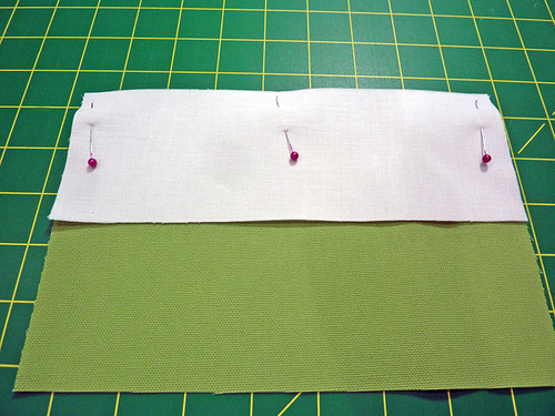 - Place each solid/print rectangle pair right sides together, aligning their vertical center 7¾” sides, Pin in place.