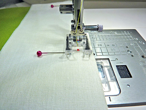 - Re-thread with thread to best match the darker fabric in the top and bobbin, slightly lengthen the stitch. Topstitch in place within the darker panel. We used our Janome Edge Guide foot for a super precise seam.