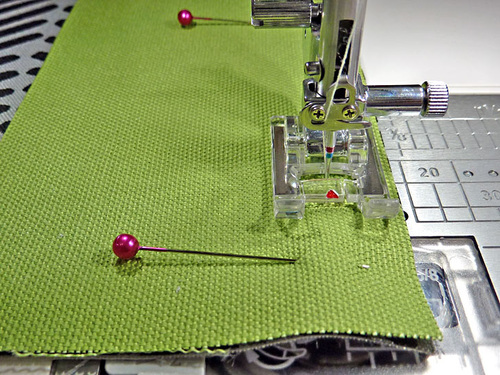 - If necessary, re-thread the machine with thread to best match the tab fabric in the top and bobbin and re-set the stitch length to normal.