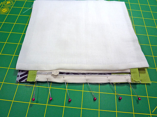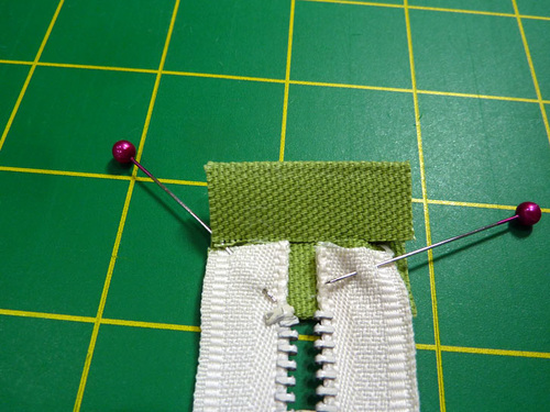 - Re-fold the tab along the original crease line, sandwiching the zipper ends between the layers. Pin in place; the inner folds should be flush on either side of the zipper.