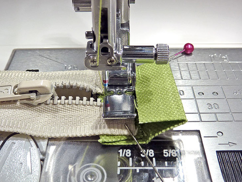 - NOTE: As with all zipper insertions, when you feel you are approaching the zipper pull, stop with your needle in the down position. Raise the presser foot and twist the layers slightly so you can access the pull to move it out of the way of the presser foot. Once clear, drop the presser foot, re-position the layers, and finish the seam.