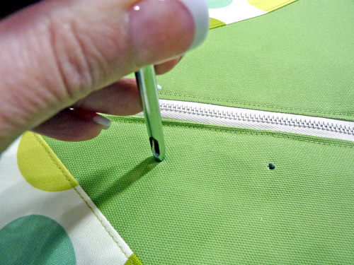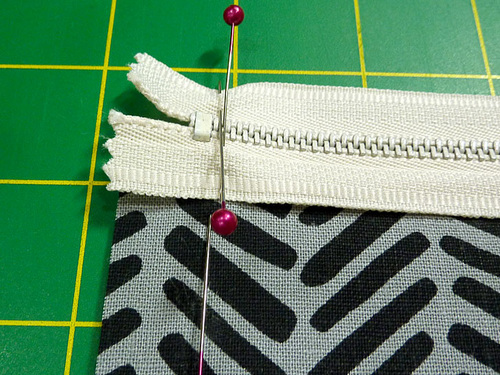 - Smooth the zipper into position across the top and mark the bottom end of the zipper tape at the ½” mark at the left edge of the panel. Place a pin at either side of the zipper tape. This is where the zipper will be trimmed to fit if necessary.