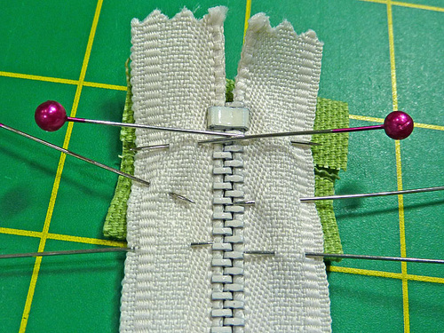 - Place the bottom end of the zipper right side up on top of the opened tab. The lower folded edge of the tab should be flush with the marking pins that denote your trim point. Pin through the zipper and the tab.
