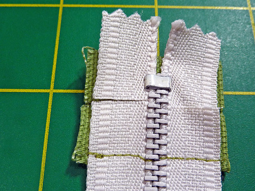 - Stitch across the zipper close to the lower folded edge. Remember, if need be, to hand walk across the metal zipper teeth to avoid damage to your needle.