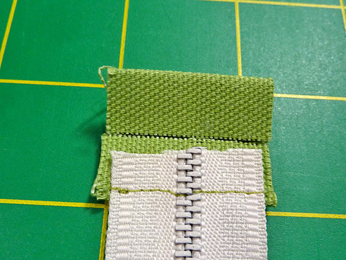 - Slip the top ends of the zipper into the tab. The ends of the zipper tape should be flush with one folded-in side of the tab. The top metal stops of the zipper ends should sit just outside the fold of the tab. If they don’t, trim the zipper ends slightly to adjust the fit. We trimmed our zipper ends for a smooth fit. Keeping the ends together – ie. so the teeth are side by side, pin in place.