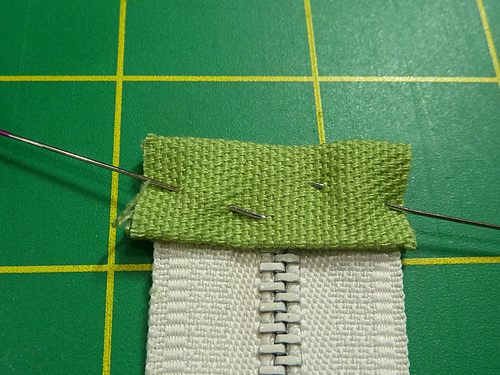 - Wrap the tab around the cut end. As above, the folded ends should be flush on either side of the zipper. Pin in place.