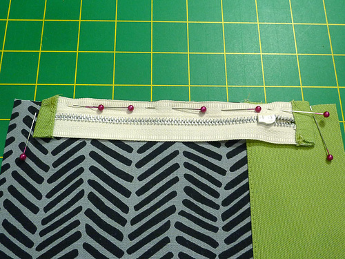 - Pin the zipper in place across the top, double checking that the zipper and the panel are right sides together, that each tabbed end sits ½” in from the sides of the panel, and that the zipper pull is situated so, when closed, it’s to the right of the front piece (if your fabric panels do not have a distinct front and back, this zipper pull position is not critical, but in general, pouches open right to left). After checking the position open the zipper about half way.