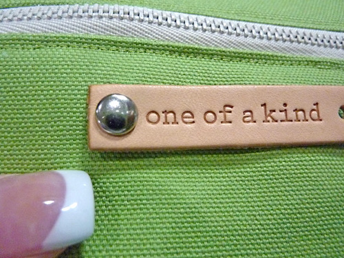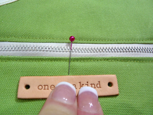 A metal zipper coordinated nicely with our chosen labels and hardware, but the technique shown below would work just as well with a standard plastic zipper. We show you how we cut the zipper to fit, but remember, when cutting a metal zipper, never use your good sewing scissors; always pull out the utility scissors from the junk drawer!