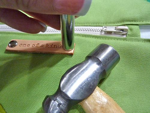 - Find the Dritz Leather Label, the two Dritz Double Cap Rivets, and the Dritz Rivet Tools, as well as your hammer and setting surface.