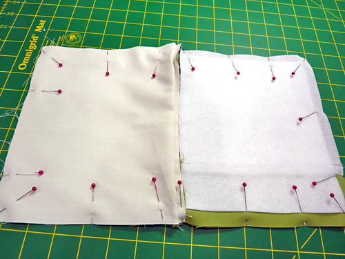- Fold the exterior pieces right sides together. Align the raw edges along both sides and across the bottom. Be especially careful to line up the seam lines on the exterior panels. Pin in place.