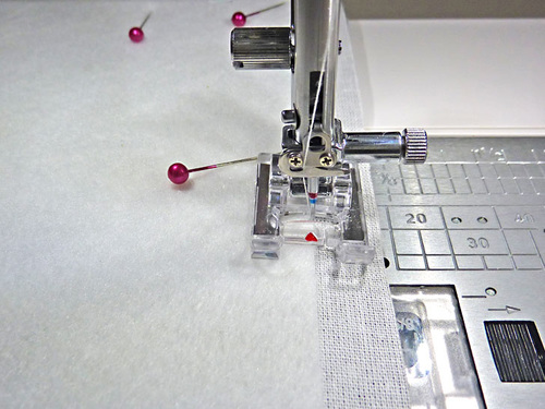 - Re-thread with thread to best match the solid fabric in the top and bobbin, slightly lengthen the stitch. Topstitch in place within the darker panel. We again used our Janome Edge Guide foot for a super precise seam.