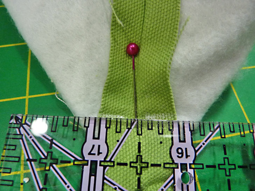 - Align these two center points with the top of the label sitting ½” below the edge stitching seam along the zipper.