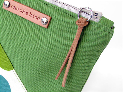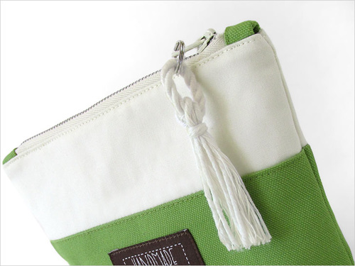 The horizontal pouch features a cloth label and a unique tassel on the zipper pull made from unraveled cotton cording.
