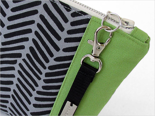 And the vertical pouch has a handy wrist strap with a fashionable metal label. The strap clips on and off the zipper pull with a matching metal swivel hook.