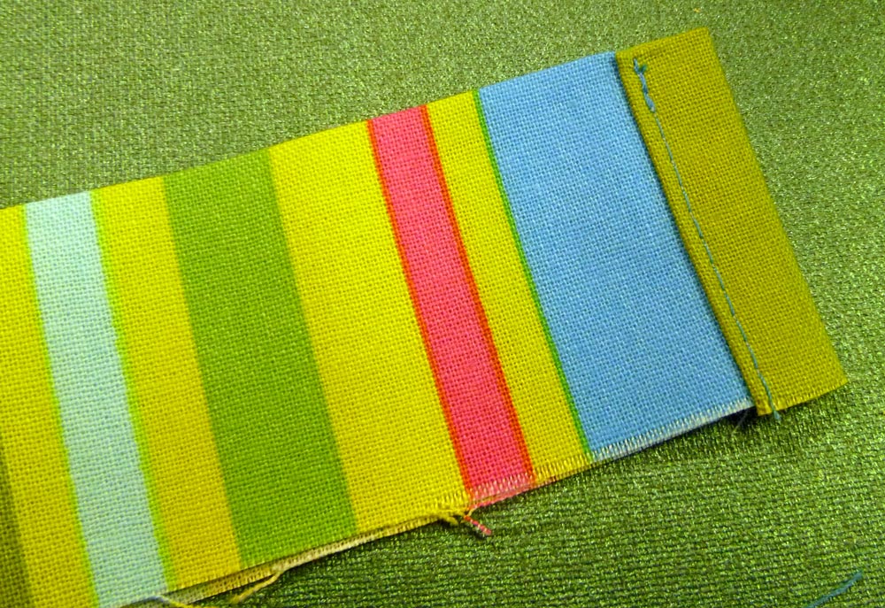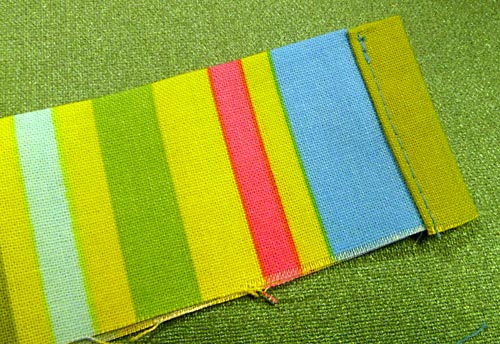- Hem one end of ruffle. To do this, turn one end under ¼” and press, turn under again ¼” and press again. Topstitch the hem in place close to the inner folded edge.