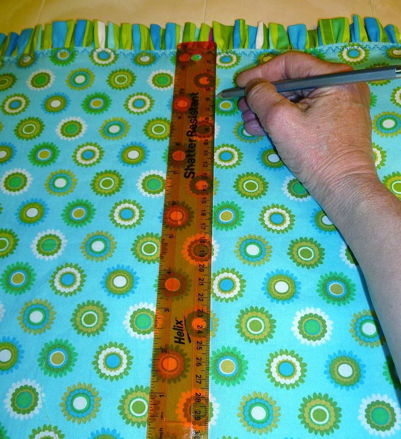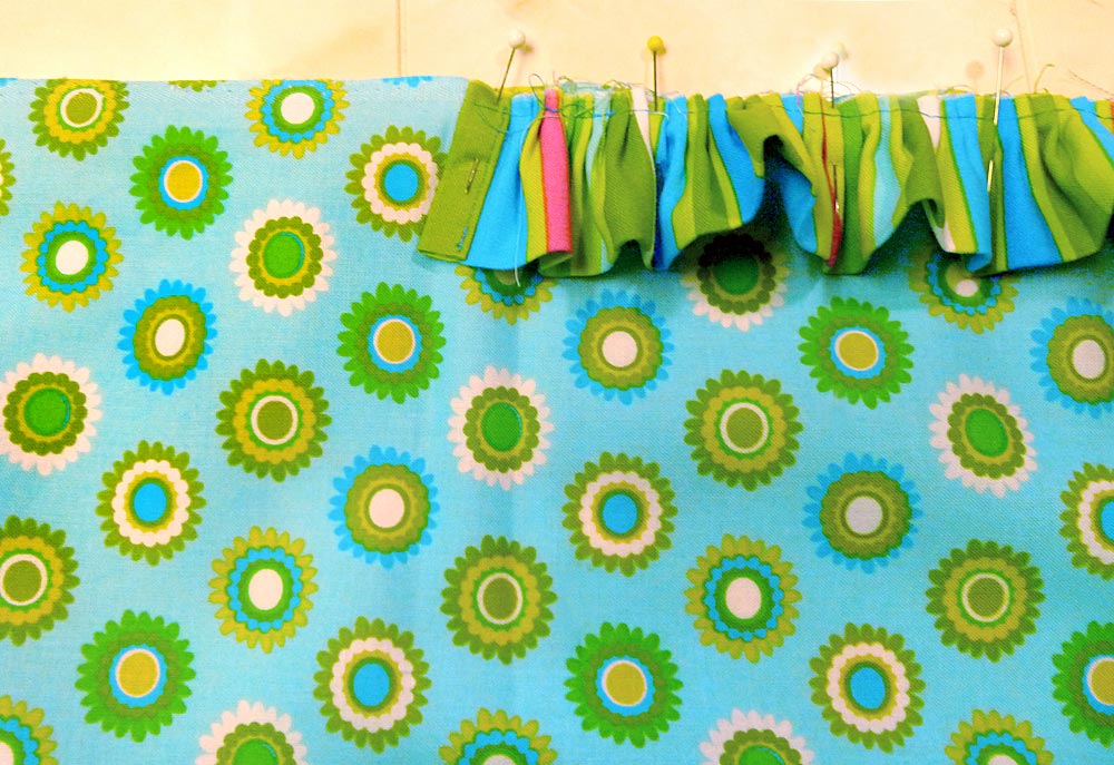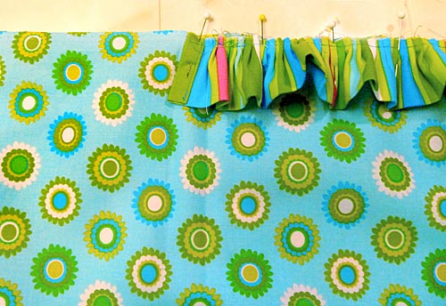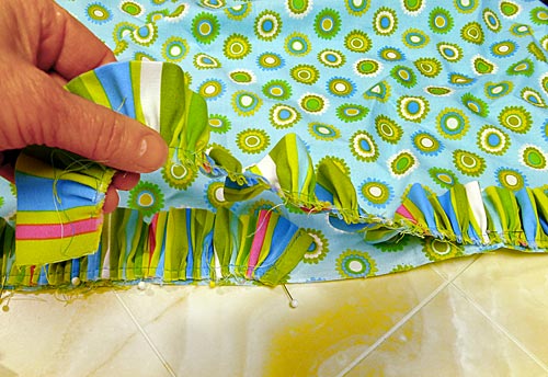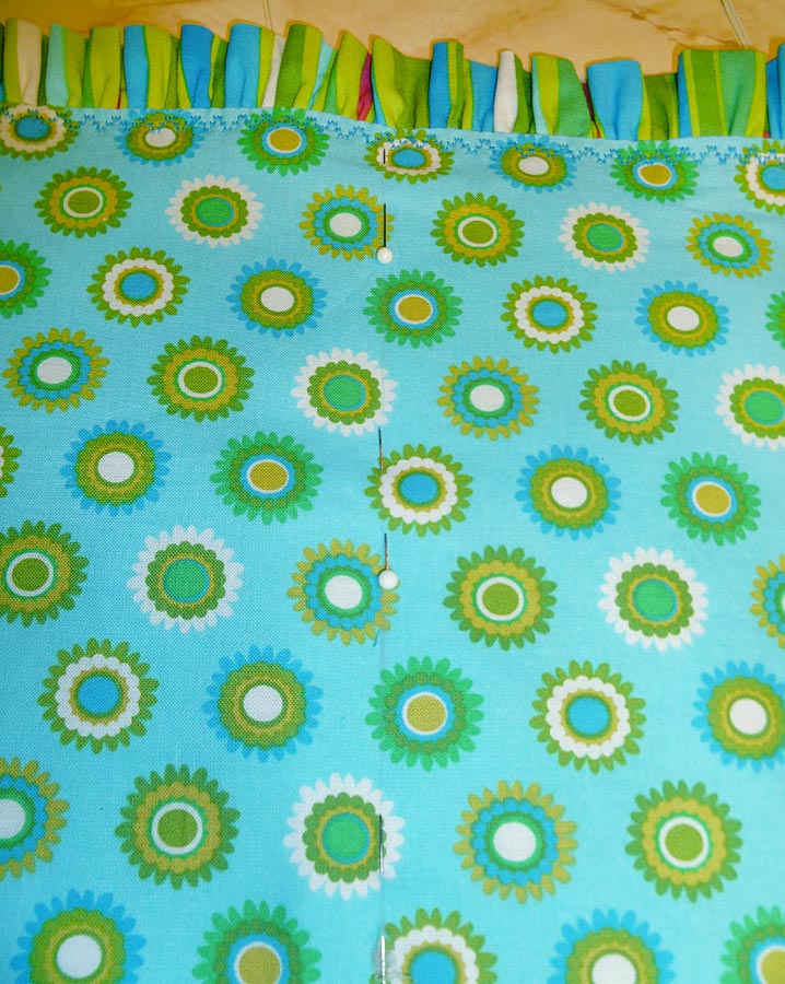 - Continue pinning all around the perimeter of the panel. When you have about six inches remaining before the beginning and end meet, lay out the end of the ruffle so it overlaps the beginning by about 2½”.