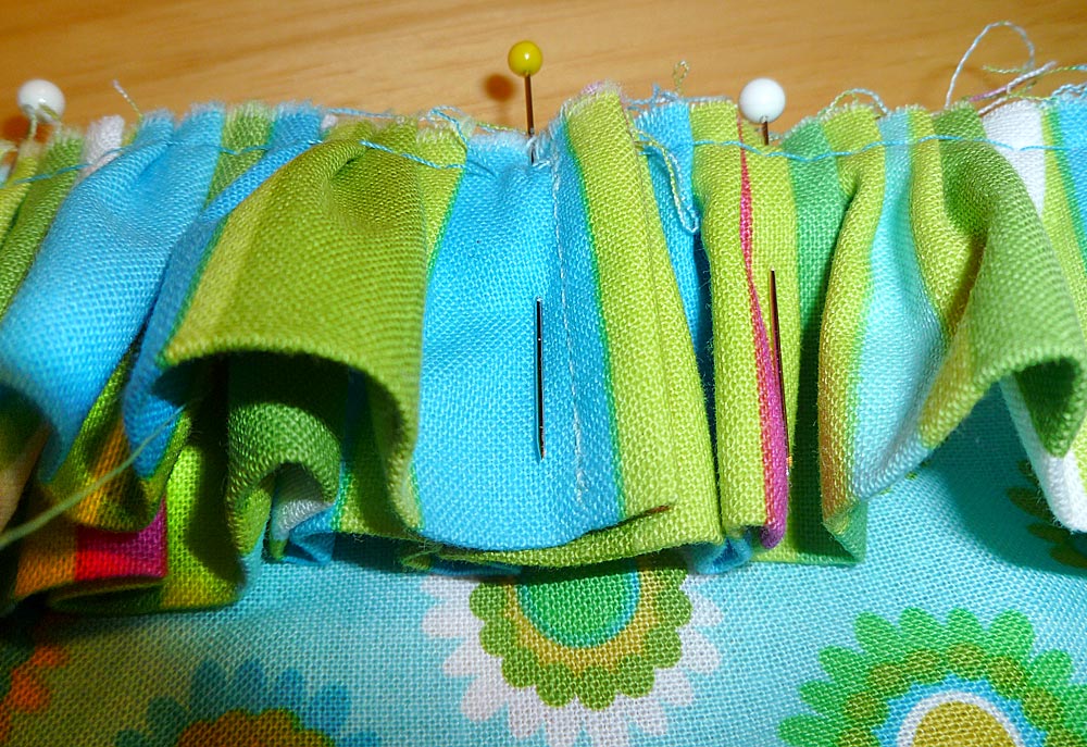 - Overlap the two finished ends so the ruffle lays flat and finish pinning.