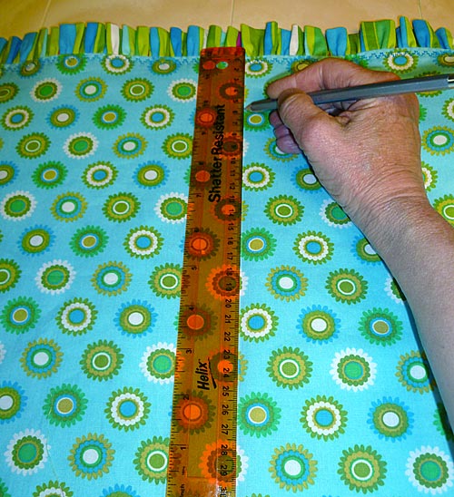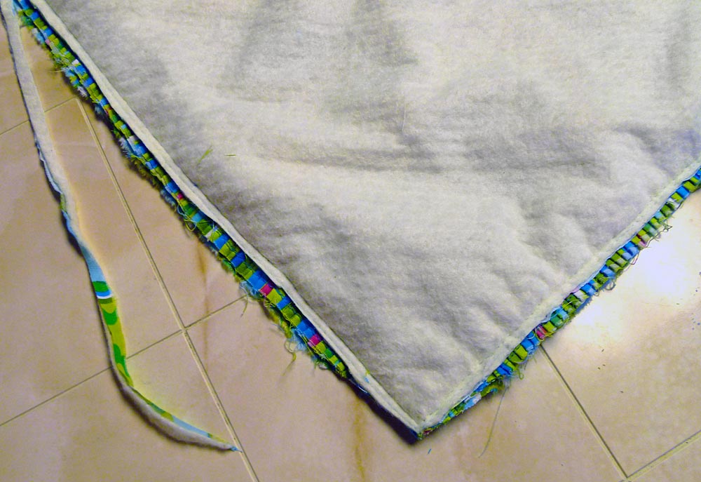 - Turn the blanket right side out through the side opening. Pull out the ruffle and press well from each side. Use a long, blunt-end tool to poke out the corners; such as a knitting needle, chopstick or point turner.
