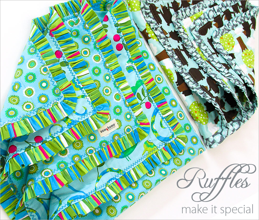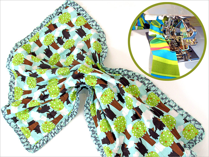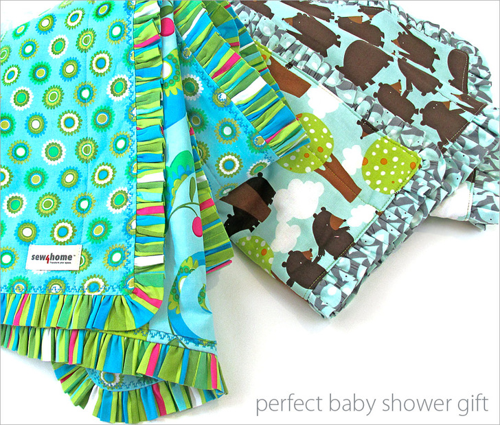 Babies need blankets. When my kids were small, I liked to think of our blanket collection as little baby drop cloths. Because, just like painters, babies are often in need of their own little piece of clean real estate, which they can then destroy as they choose. In my mind, a cute blanket is always the perfect baby gift. Our adorable design is super fast and easy to make, especially if you have a ruffler attachment.