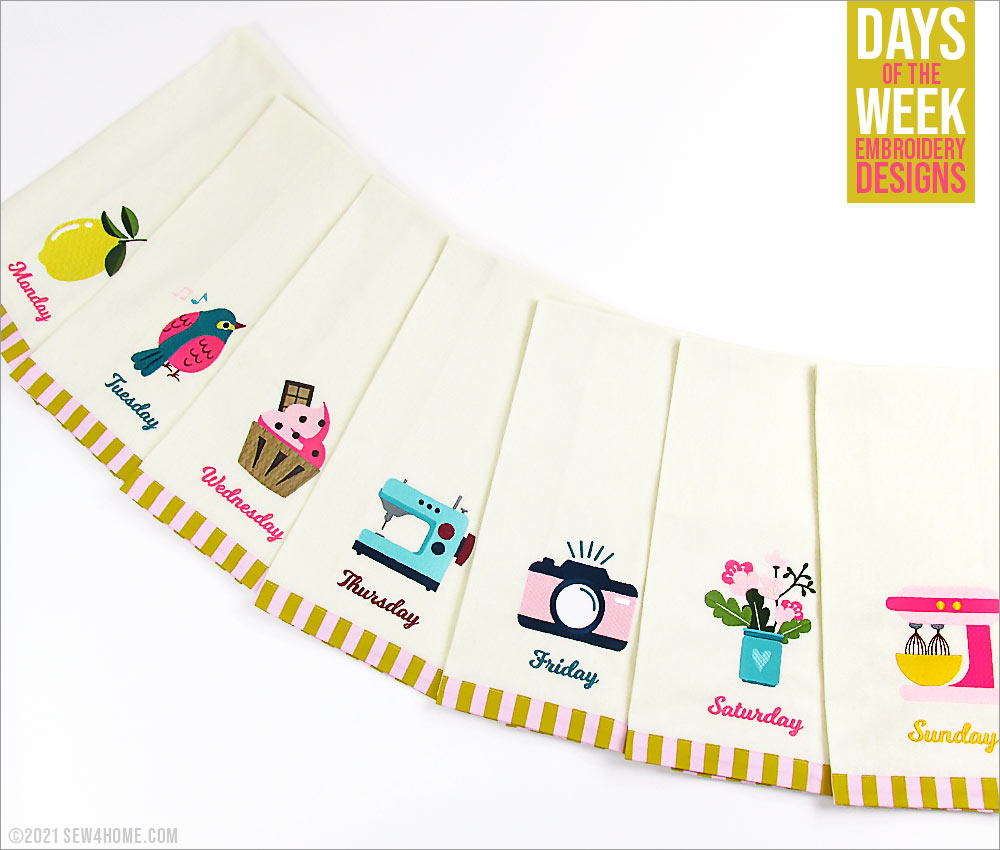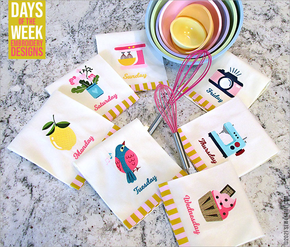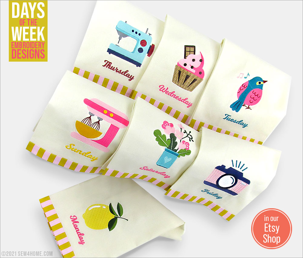 These adorable Days of the Week machine embroidery designs, available exclusively in our S4H Etsy Shop, represent some favorite at-home hobbies: from baking to sewing to social photo-ing, and more! The embroidery is split into individual components so you can mix and match your favorite Images and Days. What will you do on Sunday?