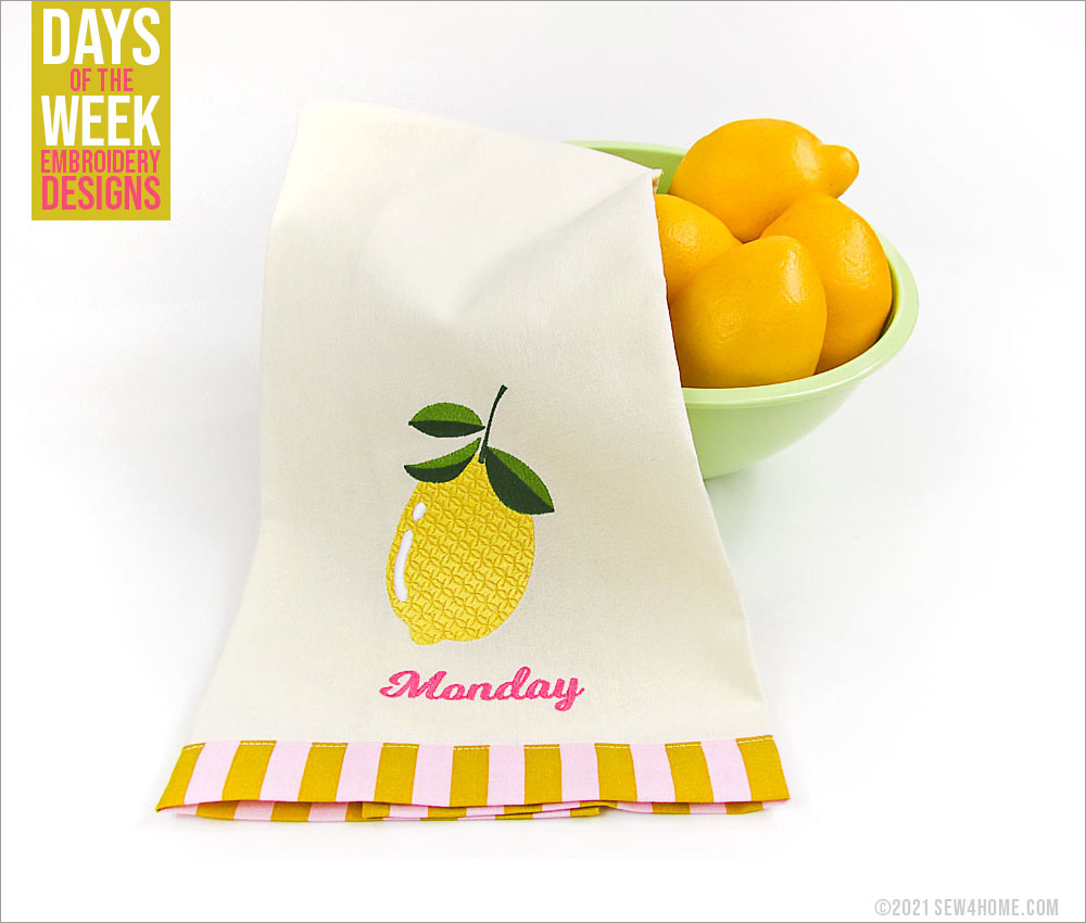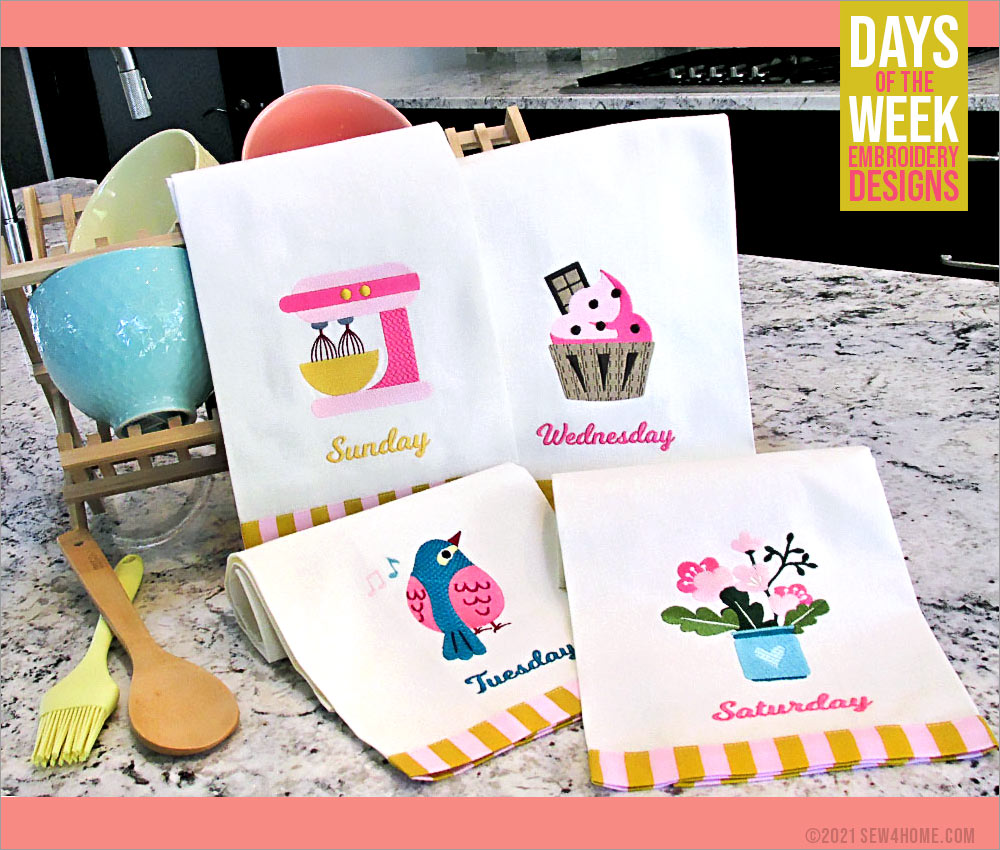We chose to stitch out our samples on a set of striking kitchen towels. As a special bonus, a step-by-step tutorial is included free with the Design Set so you can make these same banded-style towels. They would make a great wedding shower or housewarming gift idea!