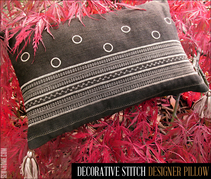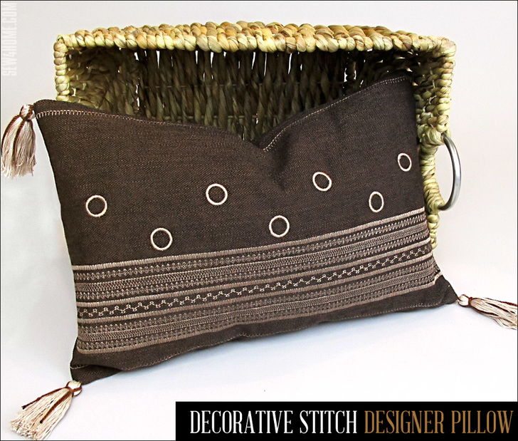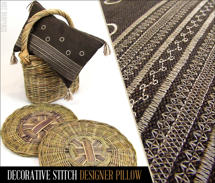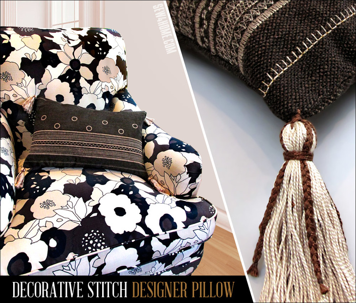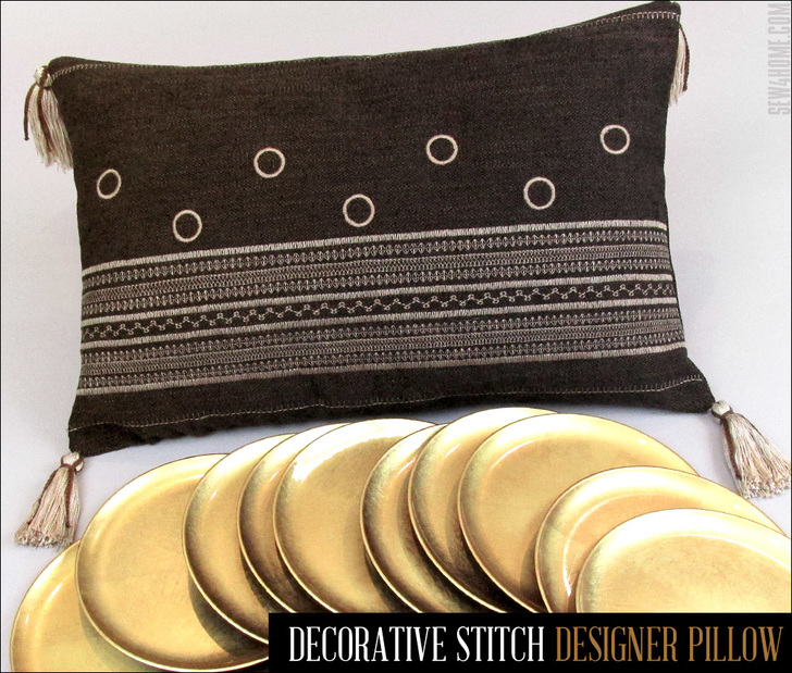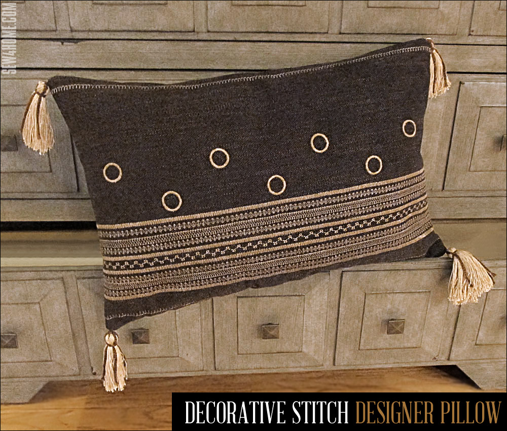 We’re always on the lookout for designer trends in retail shops, online, in magazines, and more. It was during a recent search when we spotted a number of pillows with dense panels of decorative stitching, as well as many featuring that plus embroidery accents and tassels. It was a style that had a bit of a boho feel but with a more elegant spin. Thanks to the power, precision, and flexibility of our Janome studio machines, we knew we could pull together all these trends into one fabulous pillow.