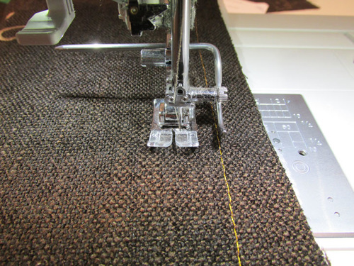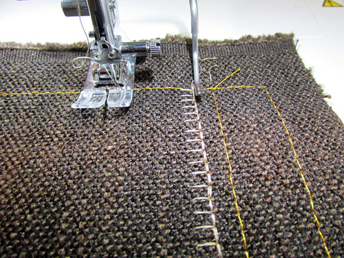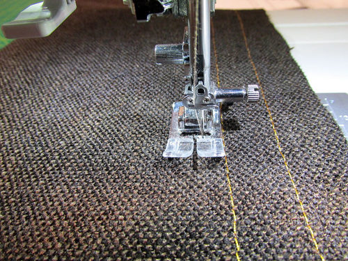 - Set up your machine for decorative stitching and select your first stitch. Use the inner basting line, the line 1” in from the basted outer seam line, as your guide. Our stitch was approximately ½” from this guideline.