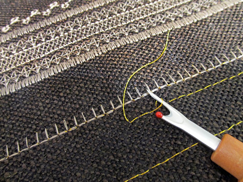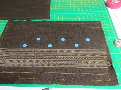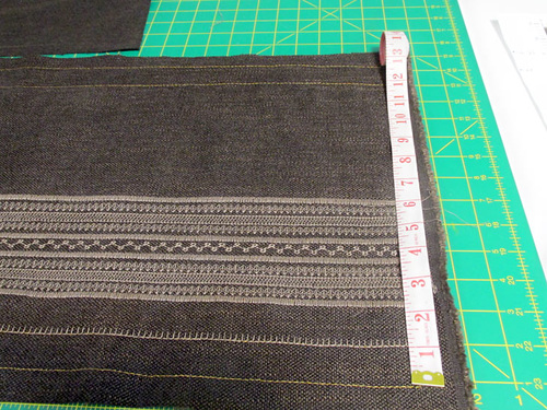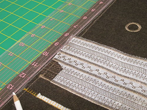 - When the main decorative stitching block in complete, press lightly. Lay the panel right side up and flat on your work surface. Place a tape measure along one side in order to plan the placement for the embroidery motifs.