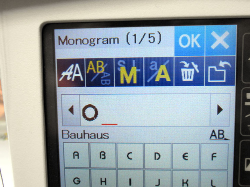 - Choose your embroidery motif. You want a very simple element in a single color. We recommend a finished size of approximately 1”. Our motif is actually the letter “O” from within the Skyline S9 built-in Bauhaus alphabet, enlarged to its maximum of 120%.