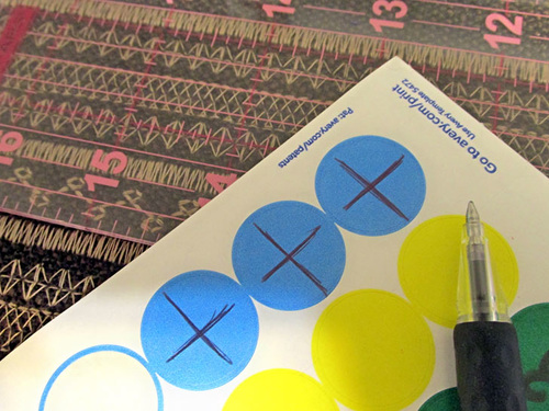 - Determine the placement for the embroidery motifs. We used standard office label dots to help us get the best look. Draw crosshairs on the circles and then place them on the fabric.