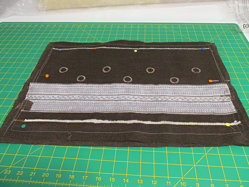 - Flip over the panel so it is right side up, which means the brightly colored basting lines are now visible.
