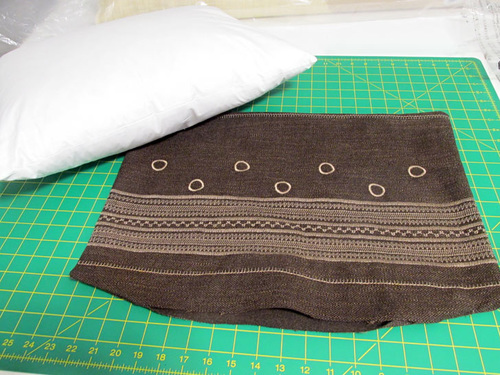 If possible, use a down or down alternative for your pillow insert. This not only lets you get that cool “karate chop” shape so popular with interior designers, it is also softer and flatter. You don’t want a “poofy” or chubby pillow form – it would distort the pretty embellishment.