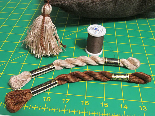 - FOUR skeins of pearl cotton floss for the main tassels in a color to match the decorative stitching and embroidery; we used a light ivory to blend with the pale taupe thread