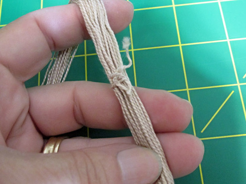 - Unwrap one skein of the light color floss. No need to undo the whole skein. Just find the tied ends and make sure that tied section is at the bottom of the tassel.