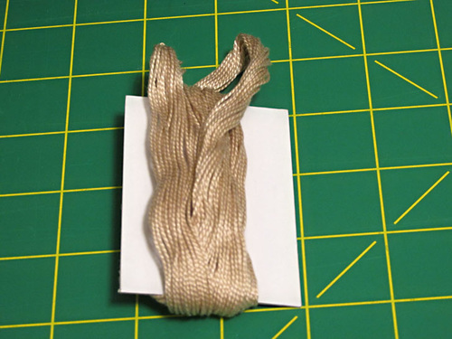 - Cut an approximate 12” doubled-strand of the dark floss for the upper tie. Insert this under the loops of the skein at the top and pull the ends up.