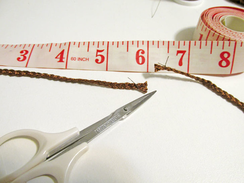 - Snip into two 6” lengths. Be careful with your cut, you need needle-and-thread tie-off knots to either side of the cut so the braids will not unravel.