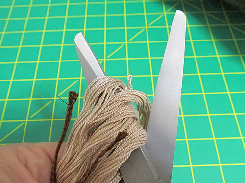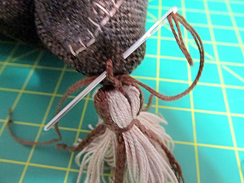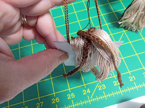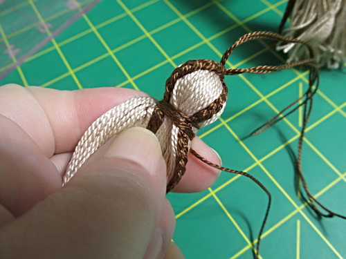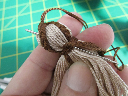 - When you’re finished going around and around, thread the end of the floss through a large eye needle and make a standard knot; it can be buried within the strands of the wrap. Pass the needle through the head of the tassel to bury the thread, trim away the excess, and allow the end to disappear back into the head of the tassel.