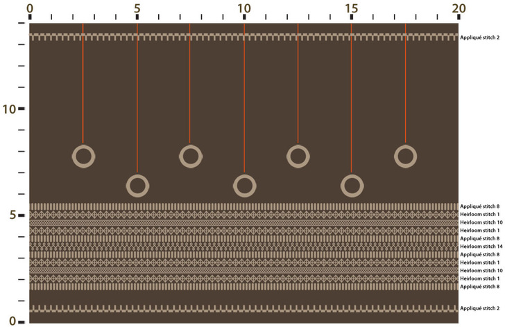 - As with the decorative stitching, the exact size and placement of your motifs may vary. We stitched seven motifs, one row of three and one row of four. The two rows are offset. There is approximately ½” between the main decorative stitching block the bottom of the first row. And, there is approximately 3½” from the top of the decorative stitching block to where the upper accent line of stitching will be. The drawing below will help show you how we positioned our seven motifs.