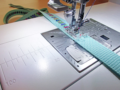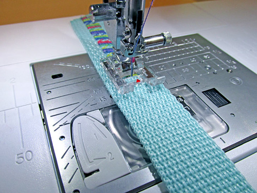 - We used the markings on our machine’s needle plate to center the foot on the belting. You could also draw in a center line to follow with a fabric pen or pencil.