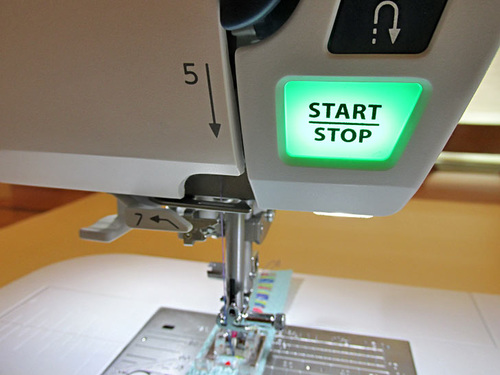 - For the best and most consistent stitching, we recommend using a Start/Stop button control rather than your foot pedal if you have this feature on your machine. This guides the fabric (the belting in this case) evenly and at a steady pace; all you need to do is lightly hold the belting at either side, allowing it to slide past your fingernails. Although you may think you are delivering even pressure with a foot pedal, it’s very easy to drift into a sporadic slow-fast-slow pace, which can put stress on the fabric and thread and cause the stitches to form less perfectly.