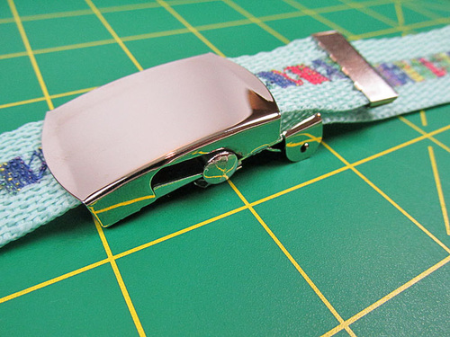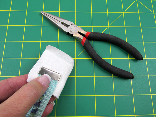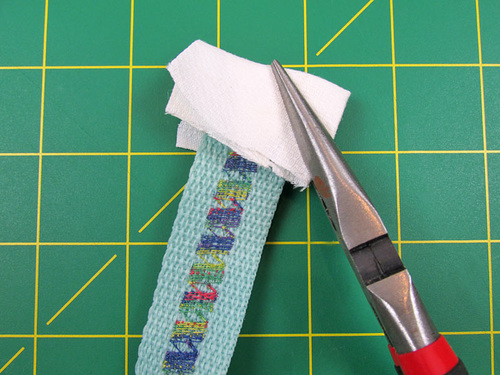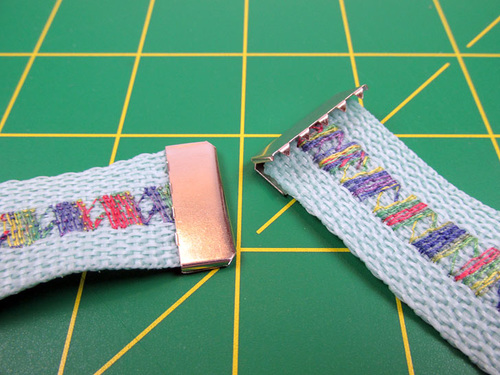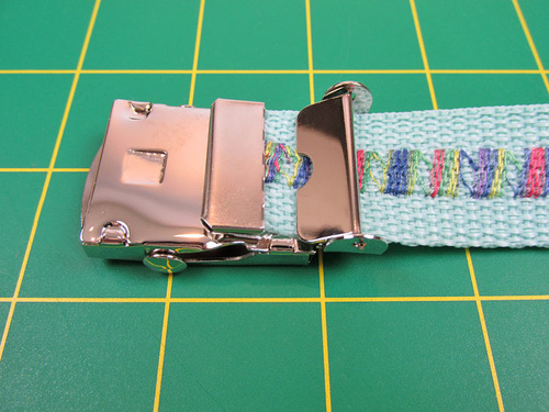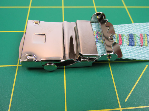 We used the same buckle on all the samples: a military style slide buckle kit from Dritz that includes the buckle as well as two metal end caps. It is very easy to apply. The only extra tool needed is a set of needle nose pliers to securely crimp the end caps.