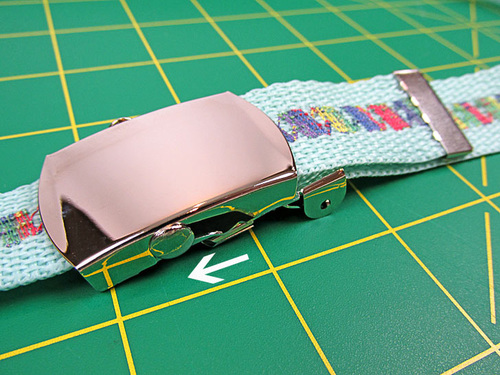 - Flip the buckle wrong side up. Open up the clamp on the buckle and slide in one capped end of the belting.