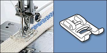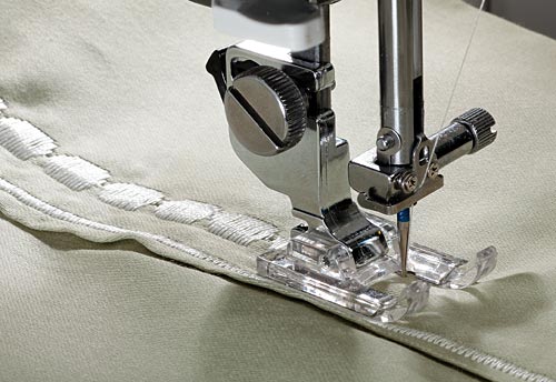 Your sewing machine may have come with a foot designed to do decorative stitching, such as a Satin Stitch foot. If you don’t have one or aren’t sure, ask your local sewing machine dealer about the decorative stitch foot that will work best with your machine.