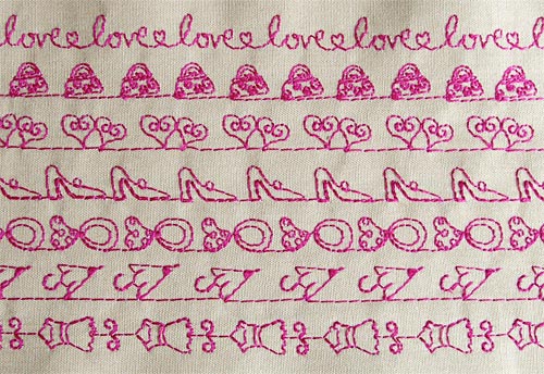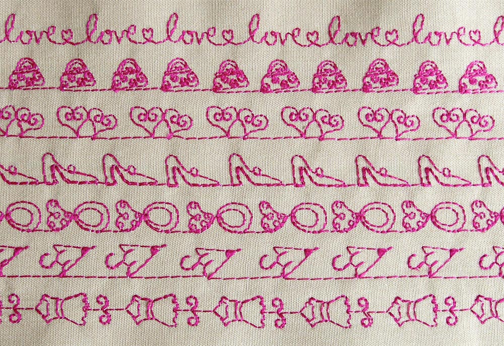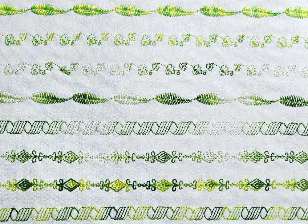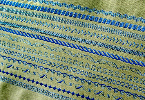This sampler idea is also a great way to keep track of decorative stitch combinations you’ve built. What are those, you ask? Some machines can actually customize the repetition of decorative stitches. For example, the Memory Craft models in the Janome line can memorize stitch combinations, save them into a built-in memory bank in the machine, and sew them out on command: square, star, oval, feather, square, star, oval, feather, square, star, oval, feather… ad infinitum. This creates a super custom look for garments, pillows and more.