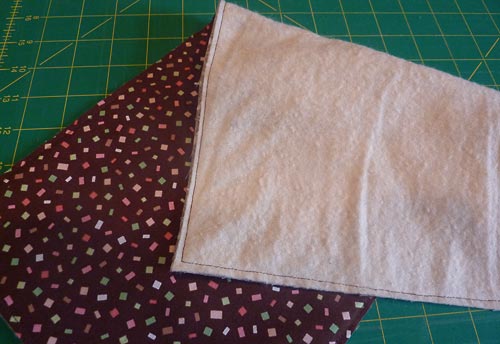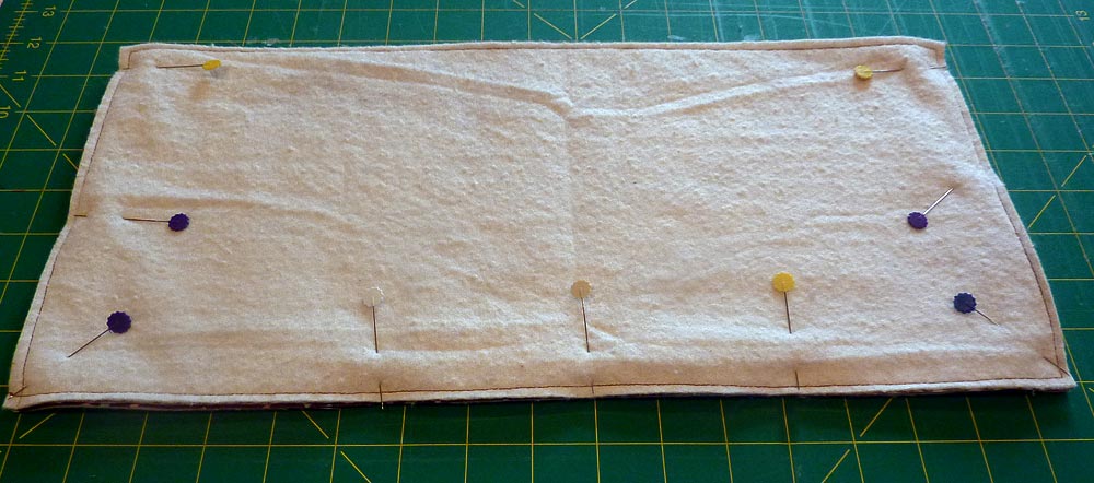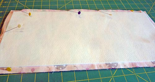 - Place a piece of batting against the wrong side of each lining panel, aligning all the edges of both layers. Pin in place. Edgestitch in place around all four sides.