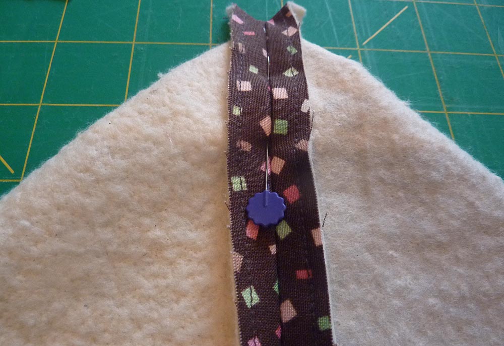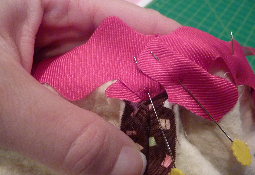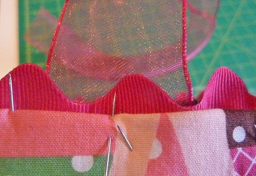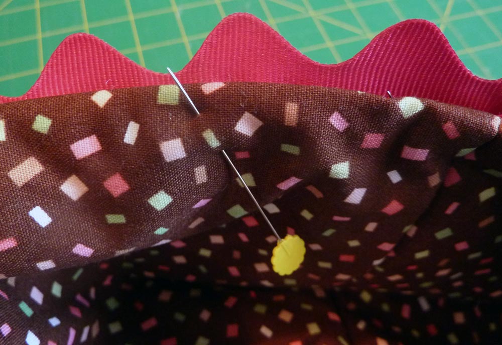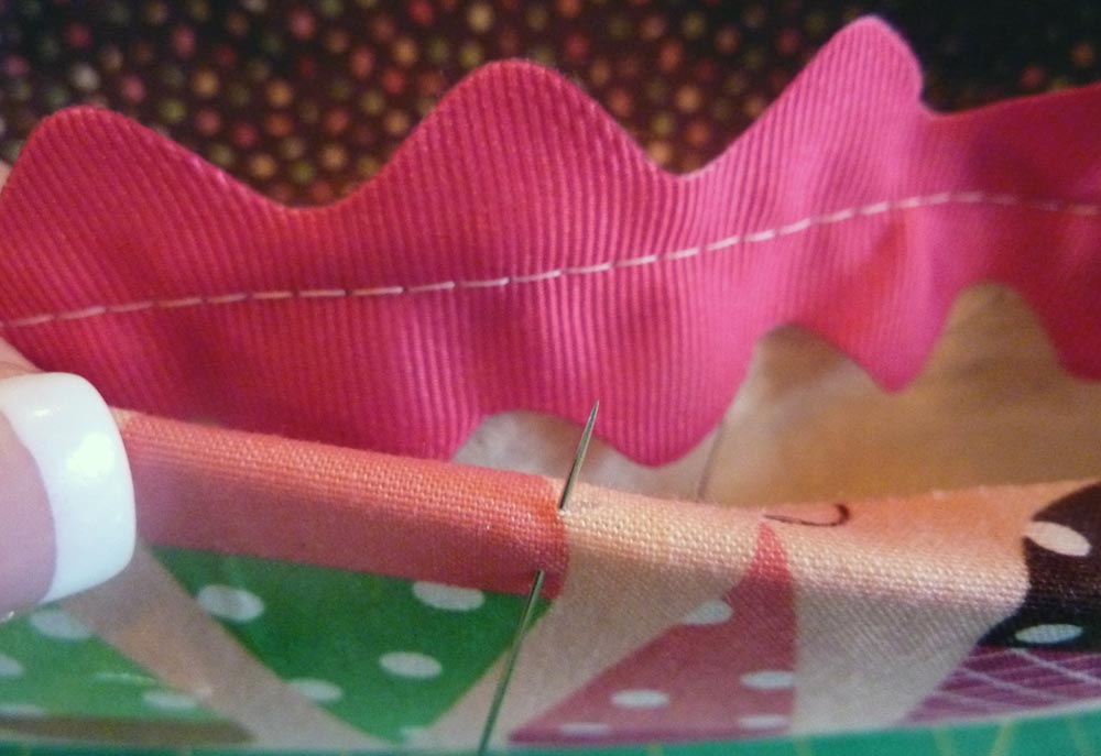 - Pin the rick rack to the top folded edge of the lining. Start at a side seam and ‘dip’ the curve of the rick rack down to hide the raw edge.