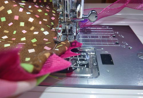 - Machine baste the rick rack in place, staying close to the folded edge, which should be right through the middle of the rick rack.